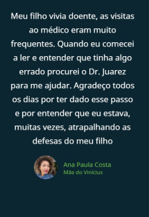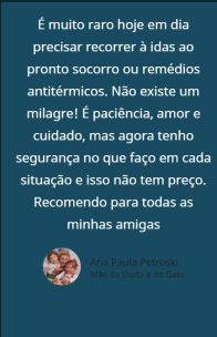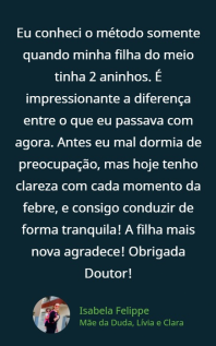 Eu sempre fui muito apavorada com relação a febre, porque minha fiha sempre teve febre muito alta e eu ficava sempre muito nervosa. O Dr. Juarez me passou todo conhecimento em relação ao funcionamento do corpo com a febre e eu consegui entender como conduzir e consegui me acalmar. Antes eu me apavorada quando ela tinha febre, hoje consigo levar com mais calma e ajudar ela.